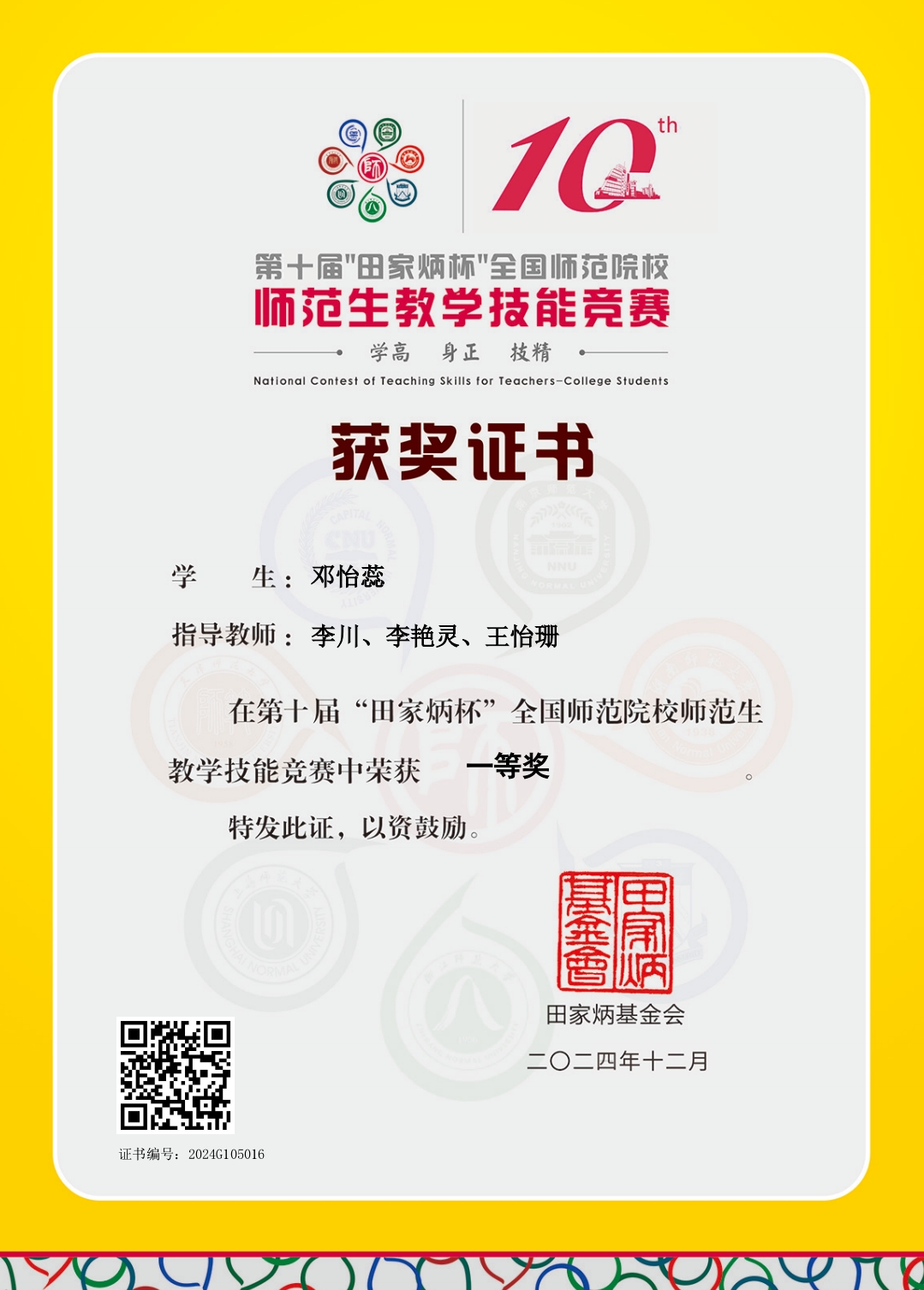 银河welcome娱乐网站邓怡蕊同学在第十届“田家炳杯”全国师范院校师范生教学技能竞赛中荣获一等奖