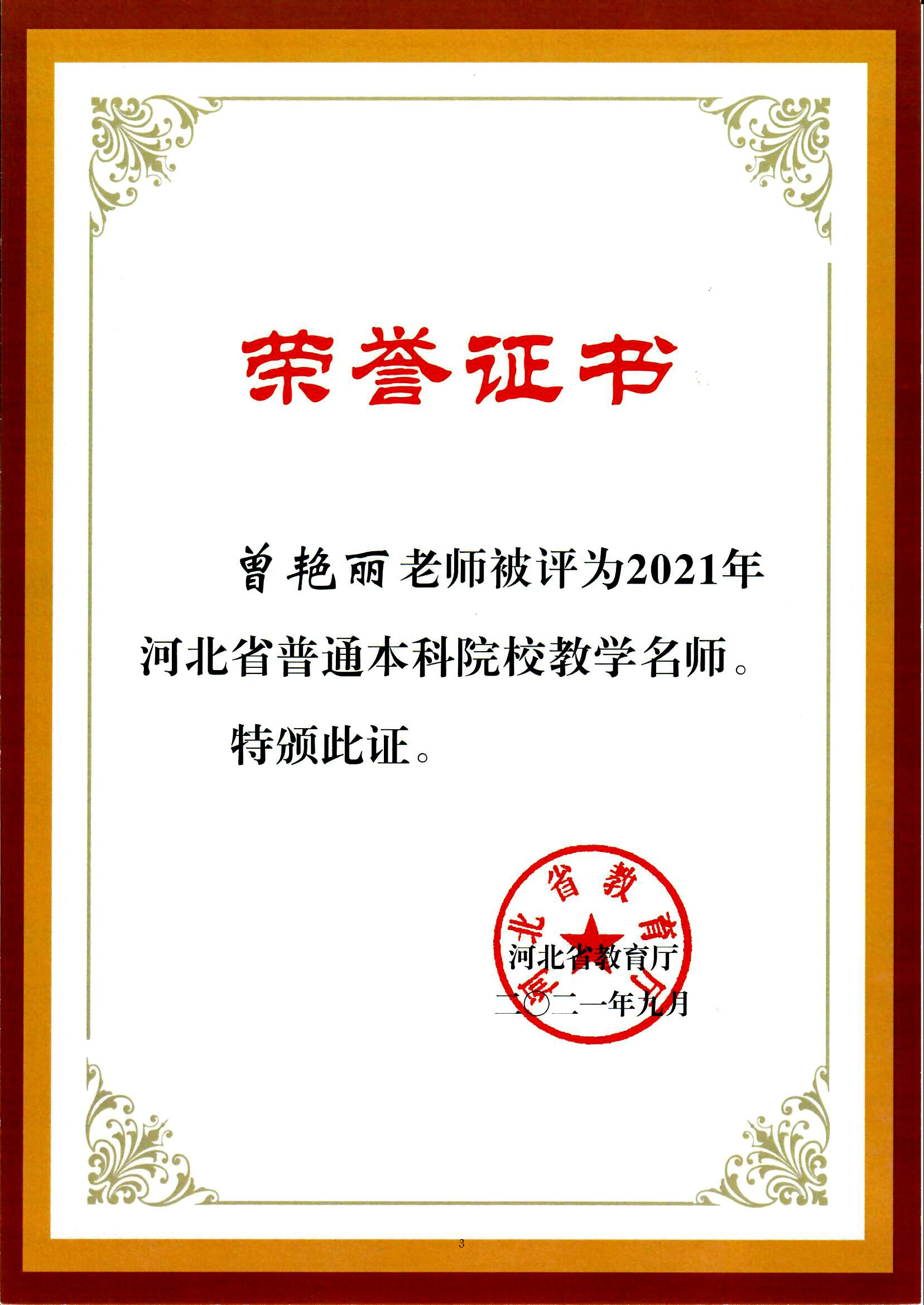 银河welcome娱乐网站曾艳丽教授被评为2021年河北省普通本科院校教学名师