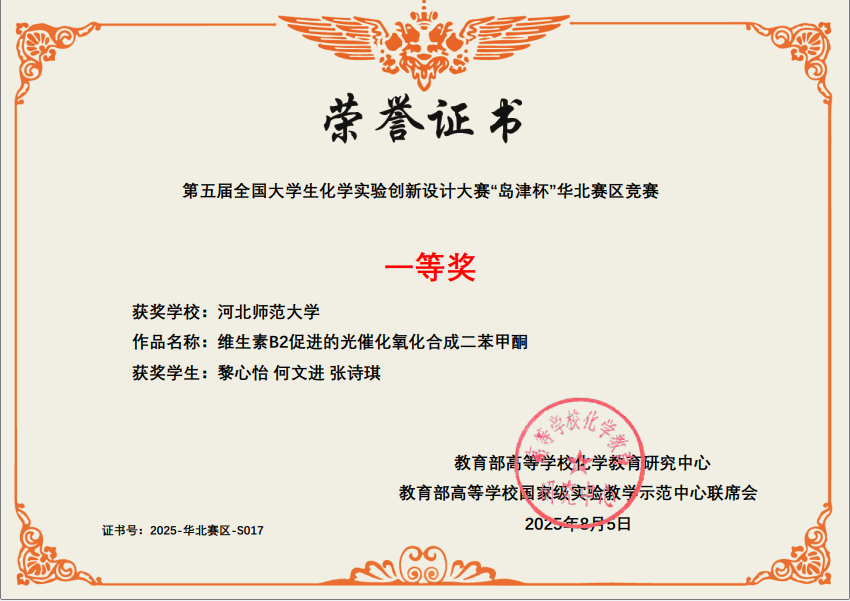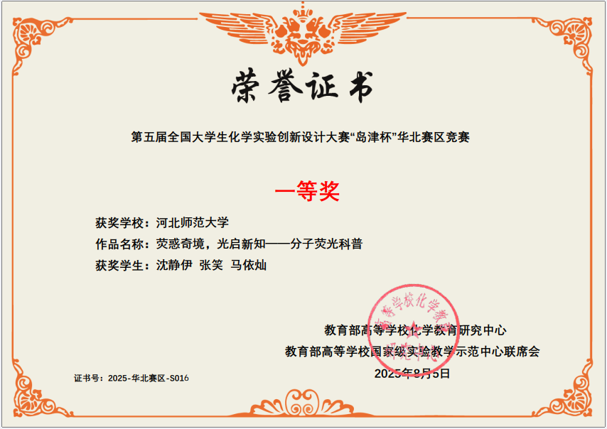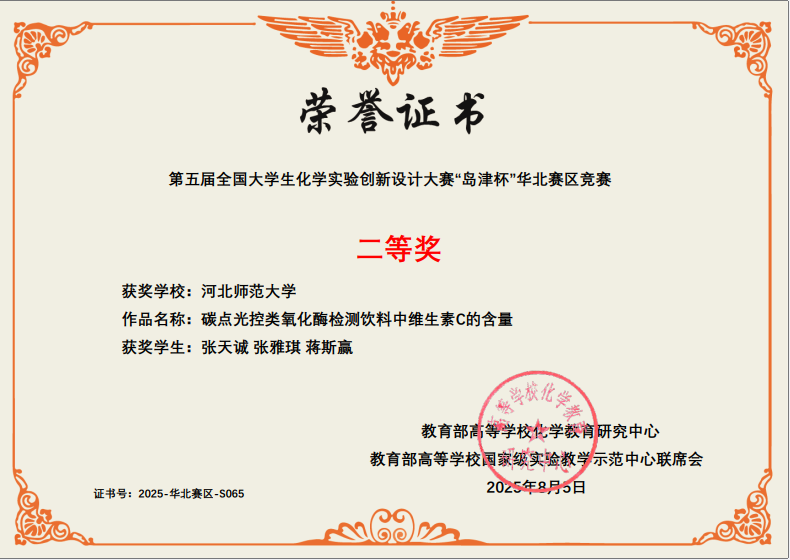2025年7月12日至14日,第五届全国大学生化学实验创新设计大赛华北赛区竞赛在河北大学举办。沈静伊、张笑和马伊灿学生团队,黎心怡、何文进和张诗琪学生团队,马欣滢、吴登稞、朱春怡和郭姝妤学生团队荣获大赛一等奖,张天诚、张雅琪和蒋斯赢学生团队荣获大赛二等奖。