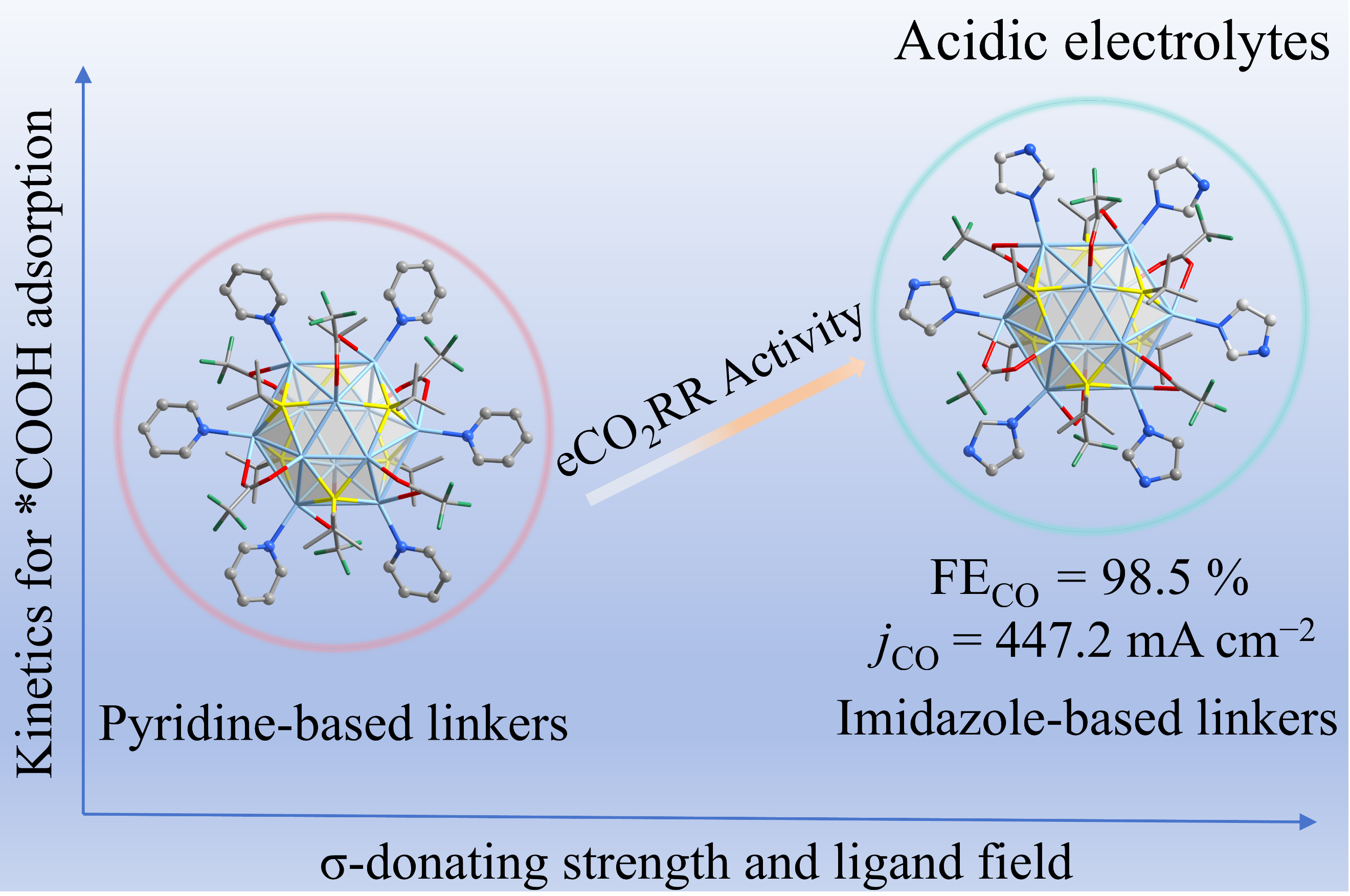 研究表明咪唑配体较强的路易斯碱性和σ给电子能力,使Ag12簇的d带中心显著上移,优化了关键中间体*COOH的吸附,降低了反应能垒,从而实现了在强酸性环境高效、高选择性还原CO2为CO。研究揭示了有机配体电子结构与电催化性能的构效关系,为设计开发具有实际应用价值的高性能酸性CO2还原电催化剂提供了新思路与策略。